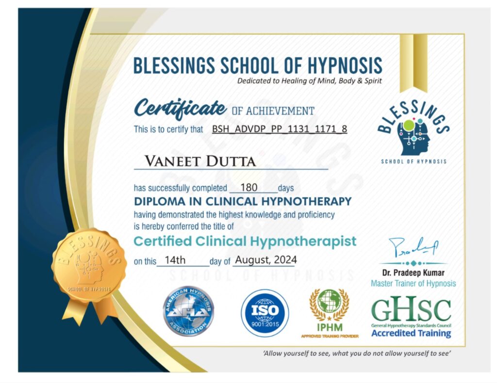 3. Mr. Vaneet Dutta's Clinical Hypnosis Therapy was a life-changing experience for me. It helped me overcome deep-seated anxiety and regain control over my thoughts. I feel more confident and at peace now." - Inderpreet Kaur (Rajinder Nagar, Delhi)